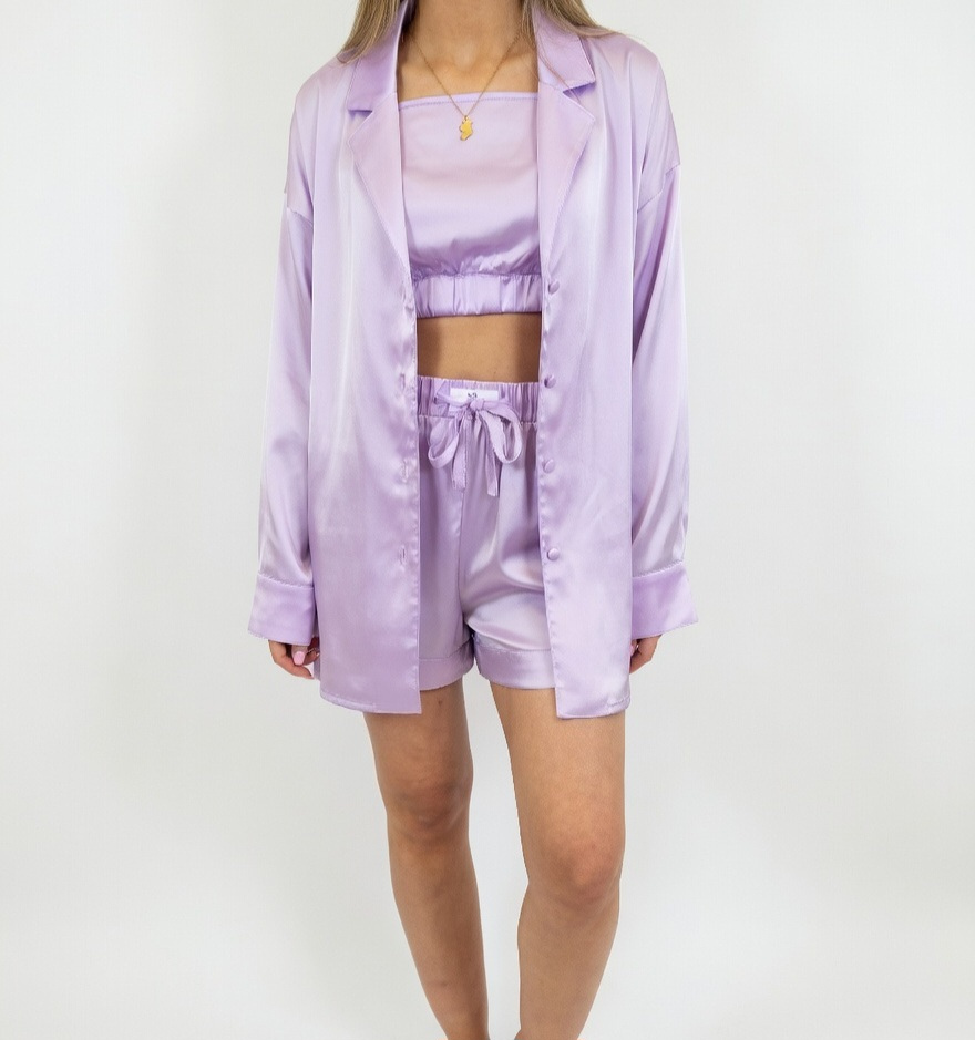 The set features a beautiful satin shirt paired with matching shorts finished with a drawstring waist and side pockets. A coordinating crop-style satin bralette is also available separately and pairs perfectly with the set.
